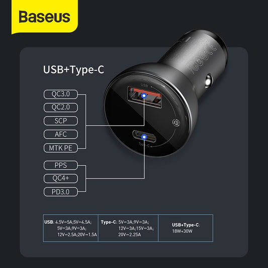 Baseus Digital Display PPS Dual Quick Charger Car Charger 45W With Mini Cable Type-C to Type-C 60W(20V/3A)