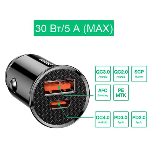 Baseus Circular Plastic A+C 30W PPS Car Charger(PD3.0、QC4.0+ 、SCP 、AFC) Black